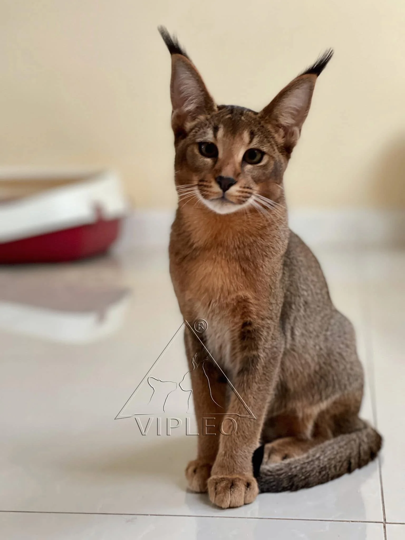 Malysh passes on his powerful structure, long limbs, and intense gaze — all signature caracal features — while also contributing a confident, gentle temperament that enhances their bond with humans.